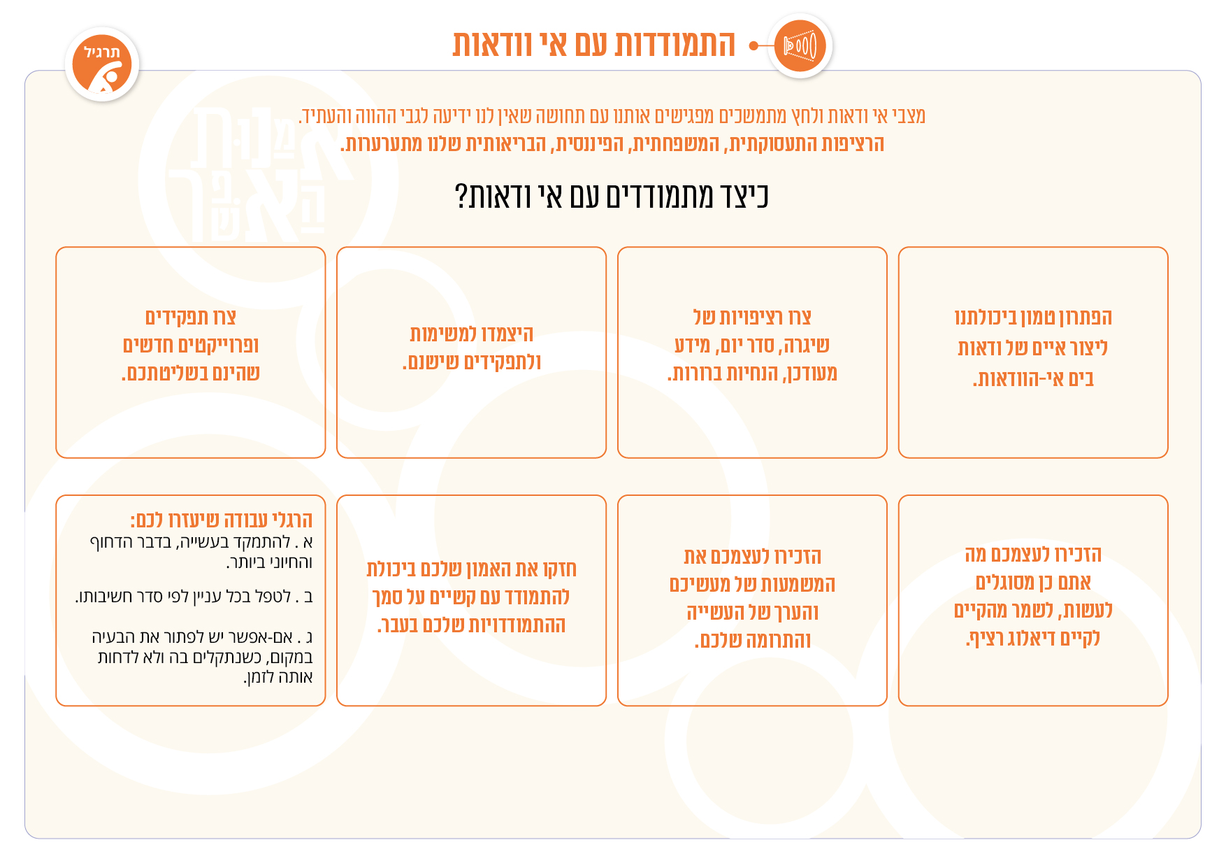 • מצבי אי ודאות ולחץ מתמשכים מפגישים אותנו עם תחושה שאין לנו ידיעה לגבי ההווה והעתיד.