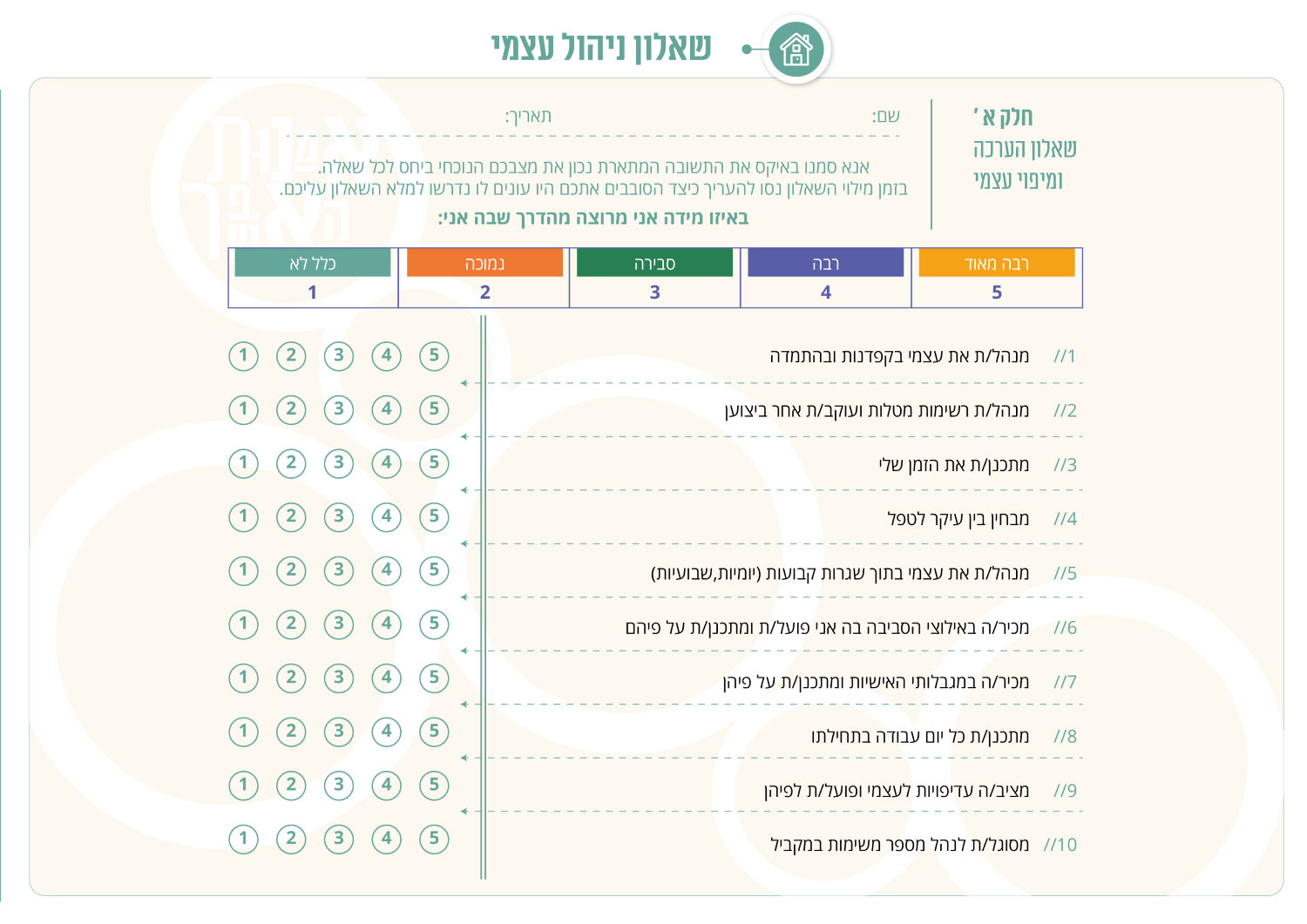 - התבוננו על מידת הניהול העצמי שלכם באמצעות השאלון.