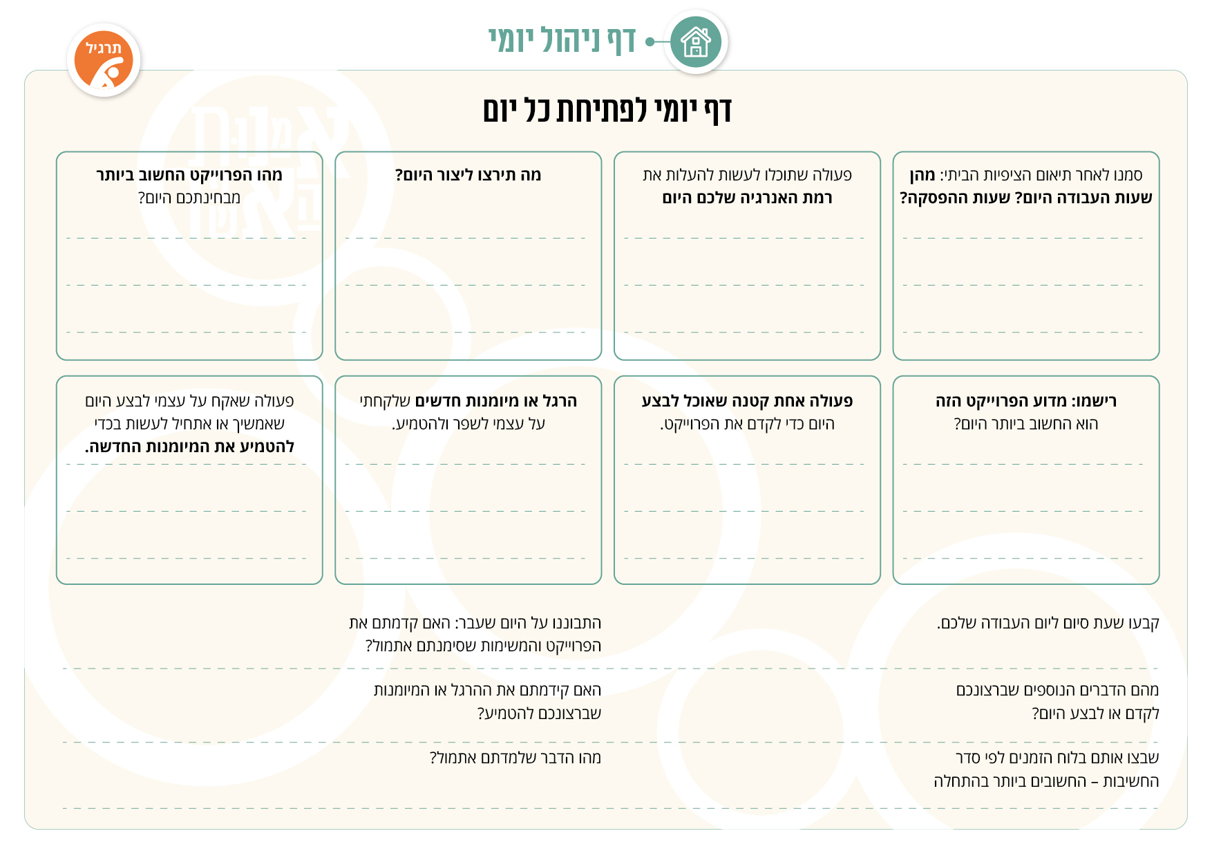 - עירכו מעקב יומי אחרי האתגר שלקחתם באמצעות דף הניהול היומי • PDF להורדה